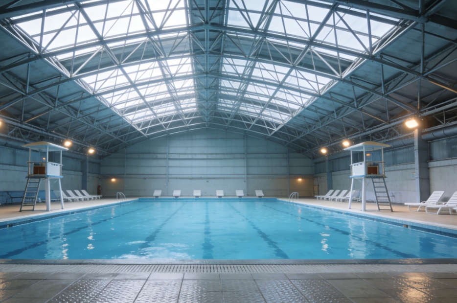 Les structures en acier permettent de créer des intérieurs spacieux et sans piliers, optimisant ainsi l'espace utilisable et offrant une grande flexibilité d'aménagement pour la piscine, les espaces de détente et les équipements annexes. La conception autorise des formes architecturales créatives, telles que des toitures courbes et des façades transparentes, qui mettent en valeur la lumière naturelle et l'esthétique tout en répondant aux exigences fonctionnelles.